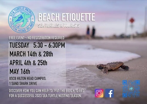 Come to learn about the nesting Sea Turtles on Hilton Head. Sea Turtles & Tourists Beach Etiquette 101, will be presented by Amber Kuehn, Director Sea Turtle Patrol HHI, at the USCB Hilton Head campus this Spring. These informational presentations are open to anyone interested, and FREE